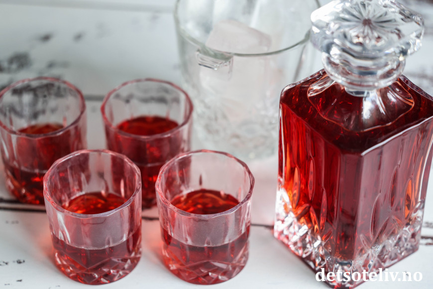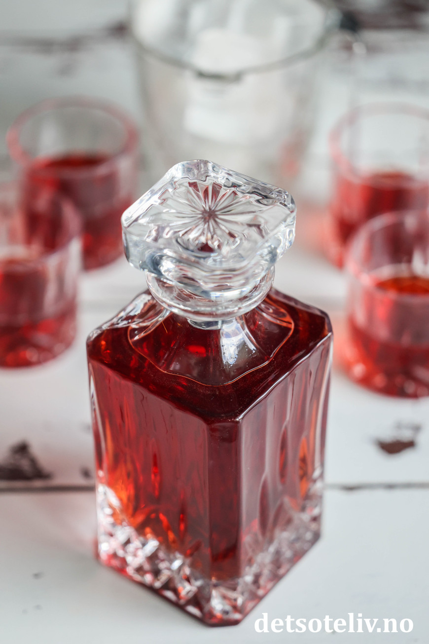 Når ventetiden er over, er ripslikøren klar til servering. Sil den og hell den over på flaske eller karaffel.