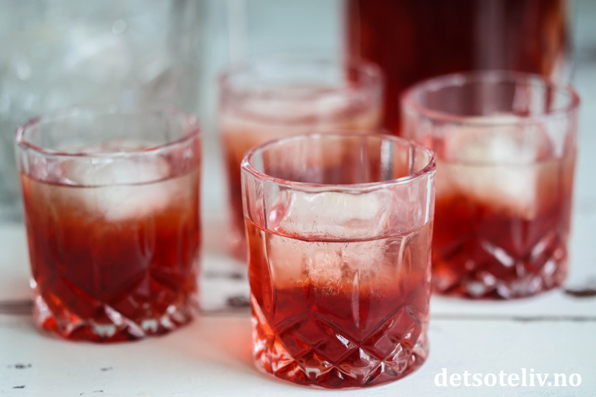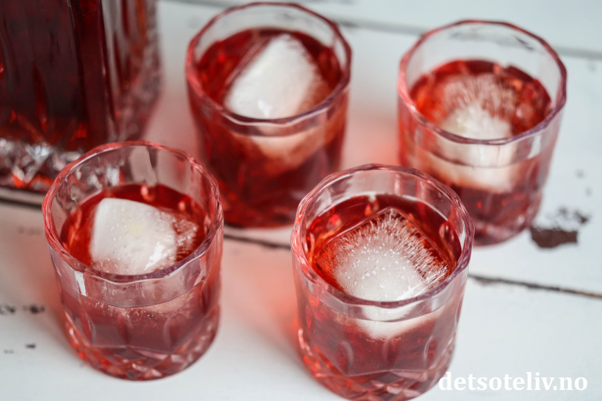 Ripslikøren du ser på bildene, lagde jeg på denne tiden i fjor. Likøren var serveringsklar noen måneder senere, men jeg hadde fortsatt noe igjen av den nå i sommer. Det var skikkelig herlig å sitte i solen og nyte ripslikør med noen isbiter i glasset! 😍