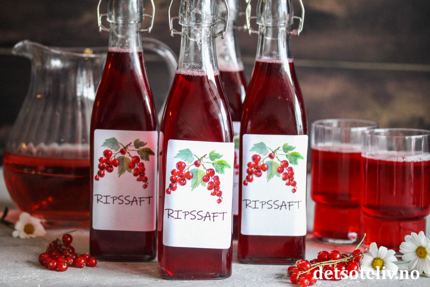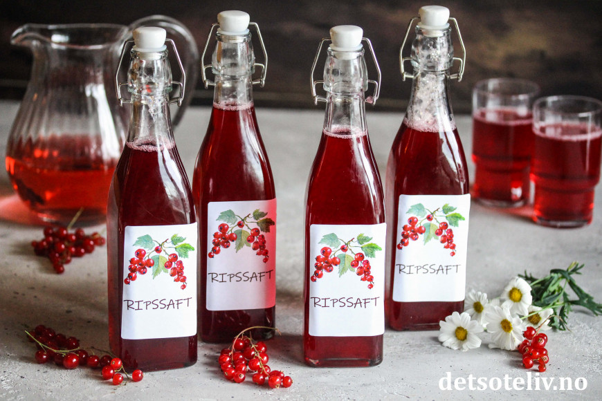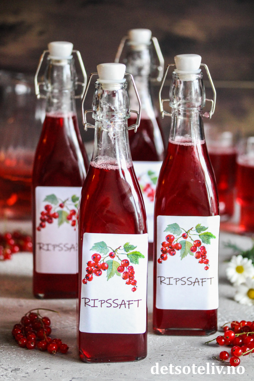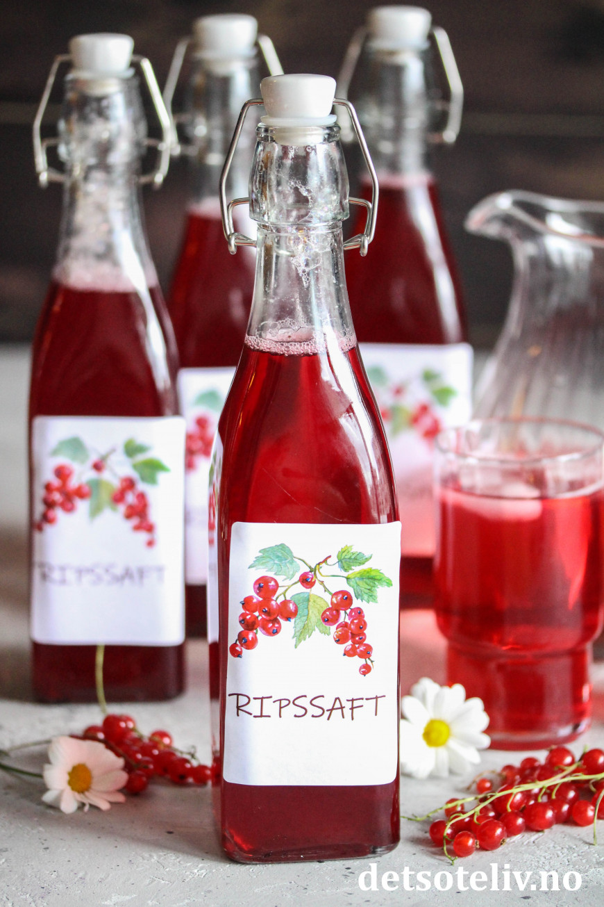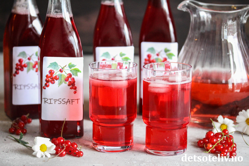 Du finner mange varianter av hjemmelaget saft HER. Nytt i år er ren ripssaft, som får herlig rødfarge og frisk og nydelig smak!