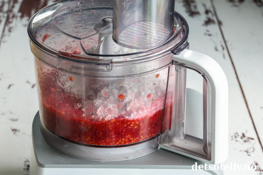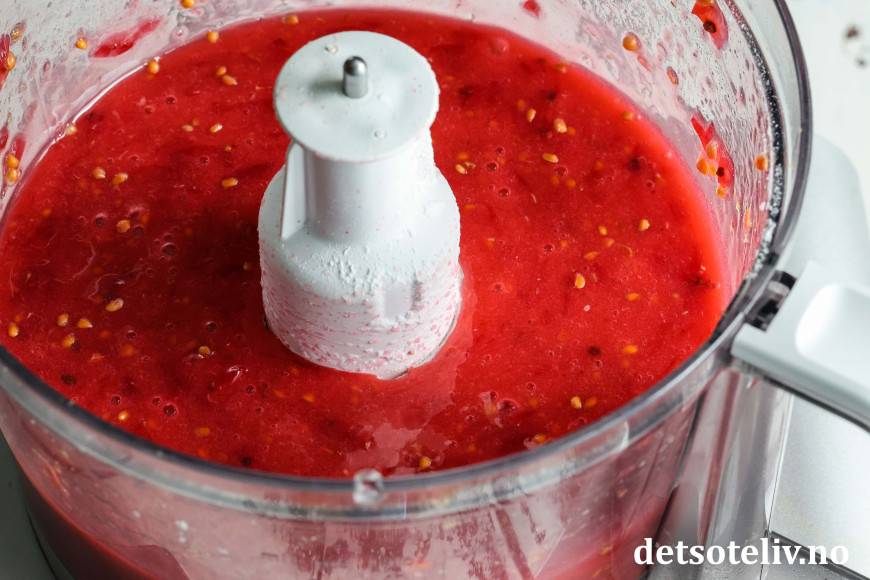 Ha ripsen i en food processor sammen med melis og sitronsaft. Kjør dette sammen til en glatt mos.
