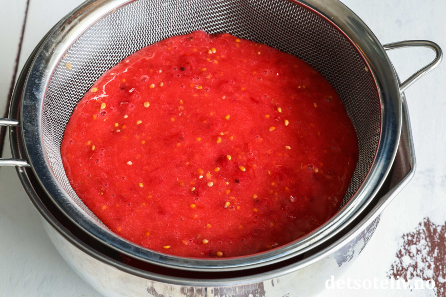 Press sausen igjennom en sil slik at du får fjernet alle frøene fra ripsbærene (husk å skrape godt av på undersiden av silen også slik at all saft fra bærene kommer med).