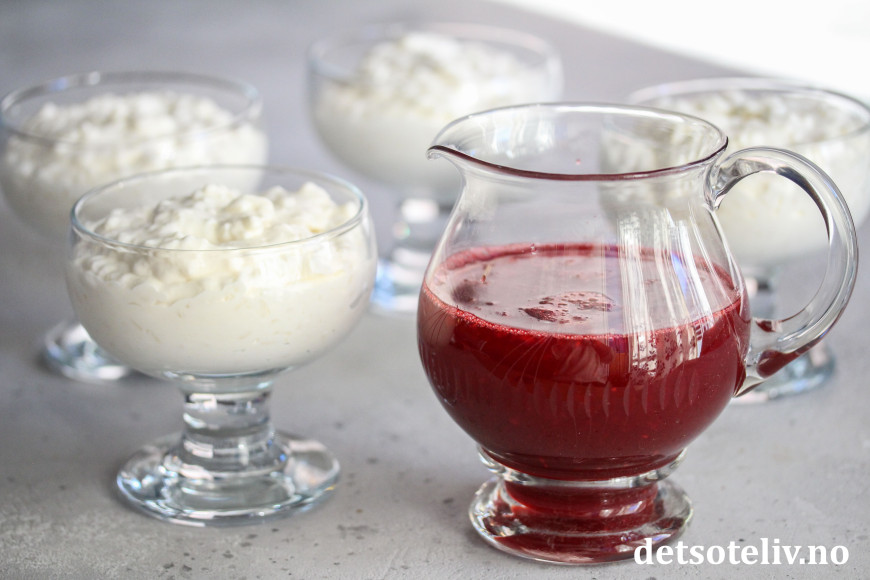Ha resten av bringebærsausen i en liten mugge slik at man kan forsyne seg med mer bringebærsaus etter hvert som man spiser.