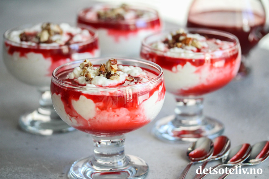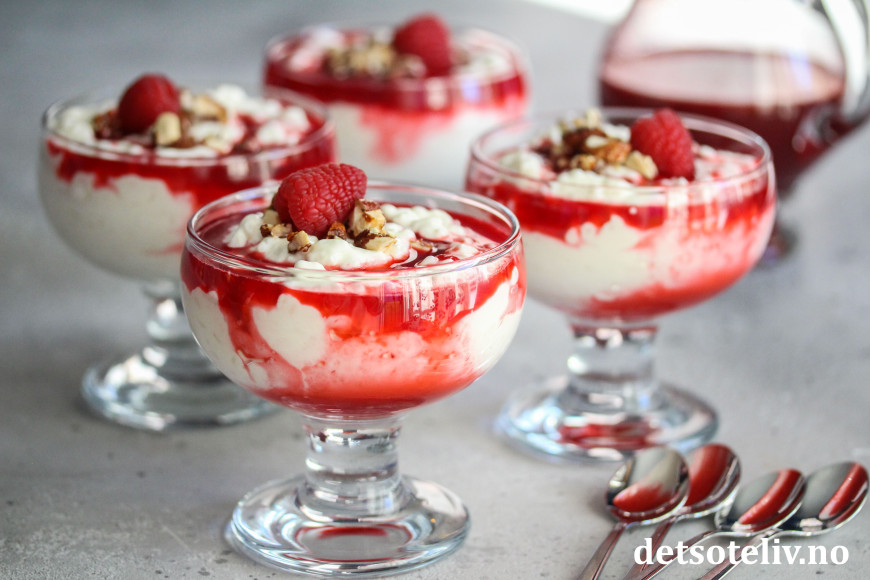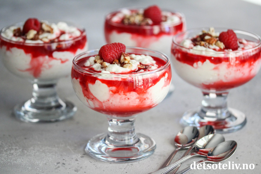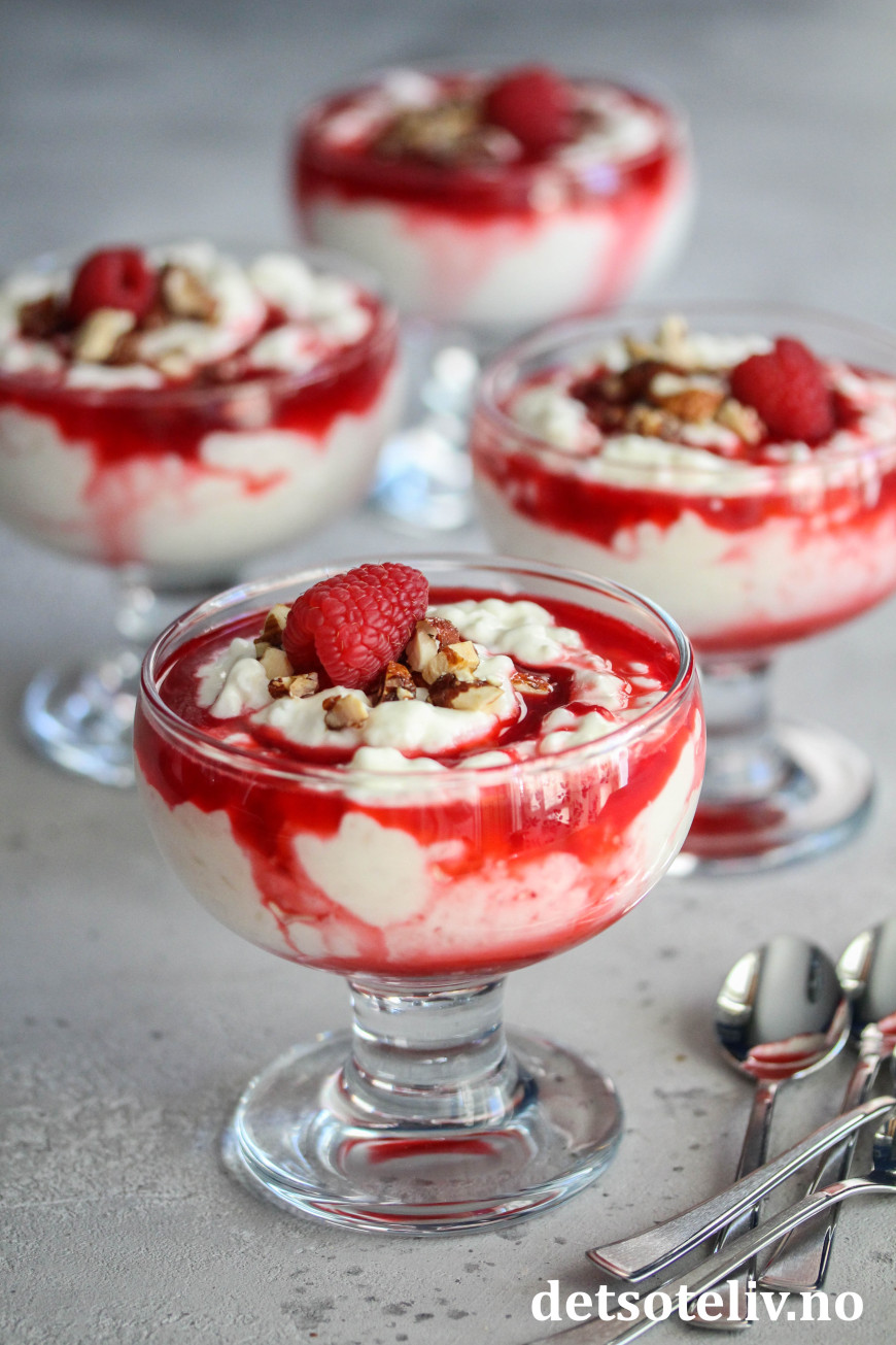 Ved servering fordeles riskremen i dype dessertskåler. Hell over bringebærsaus.