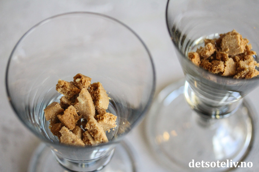 Finn frem 6 dessertskåler eller glass. Knus en pepperkake grovt med hendene og legg i bunnen av hver skål / glass.