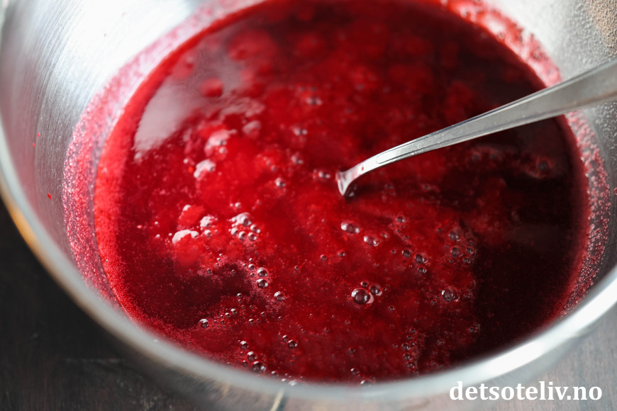 ♥ Til bringebærsausen er det som sagt det samme om du bruker friske eller frosne bringebær. Dersom du bruker frosne bringebær, trenger de ikke å tines før du har dem i kjelen, men start da med litt lavere varme slik at bærene tines gradvis.