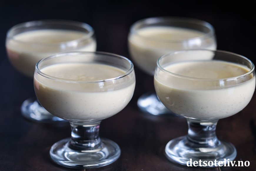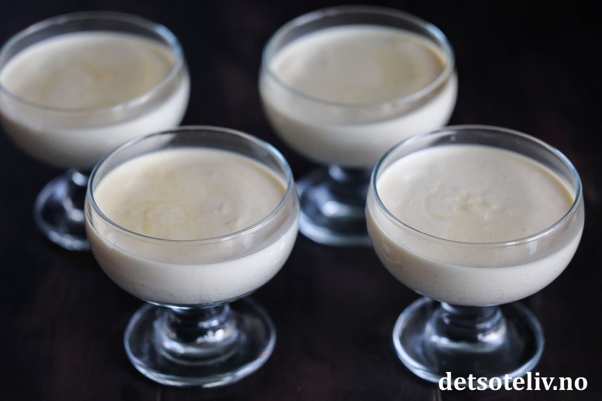 Fordel den tykke fløteblandingen deretter i dessertskåler (de skal bli ca. 3/4 fulle). Det blir 4 - 6 porsjoner, avhengig av størrelsen på dessertskålene. Sett formene i kjøleskapet i minst 4 timer og gjerne over natten. Da vil puddingene ha stivnet helt i konsistensen.
