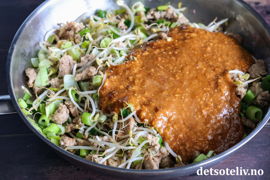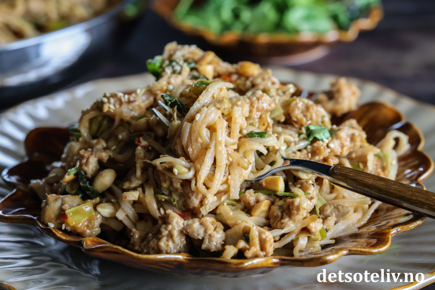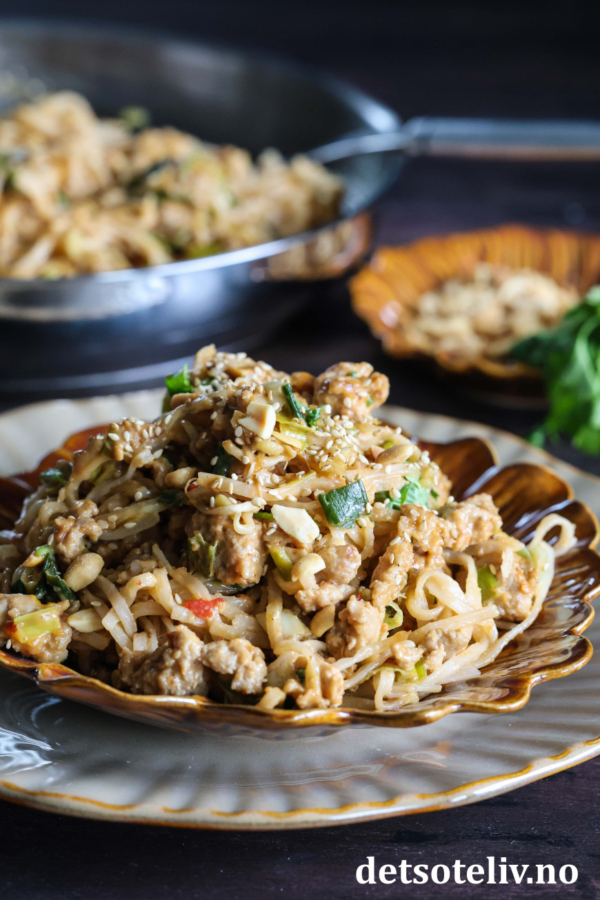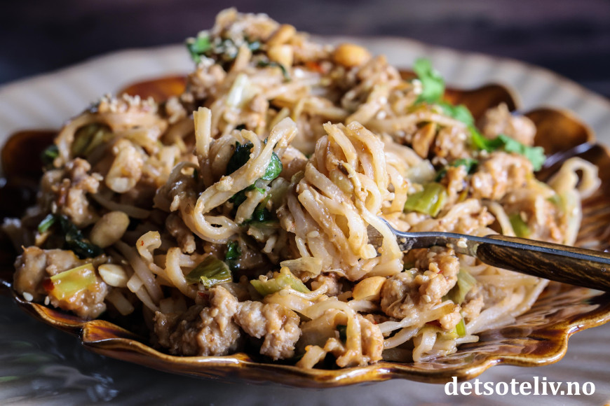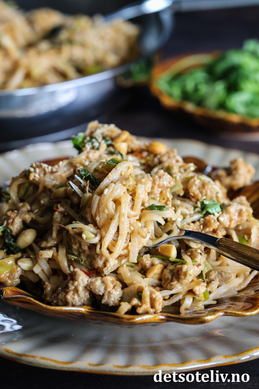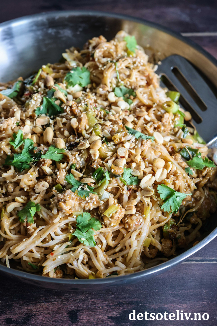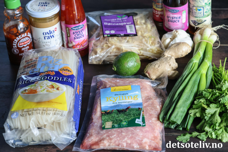 Jeg bruker kyllingkjøttdeig, men det går like fint å bruke kyllingfilet som du skjærer i biter. Det asiatiske preget kommer av risnudler, bønnespirer, koriander og en fantastisk god saus laget på søt chilisaus, lime, ingefær, hvitløk, østersaus, fiskesaus, sesamolje og deilig peanøttsmør.