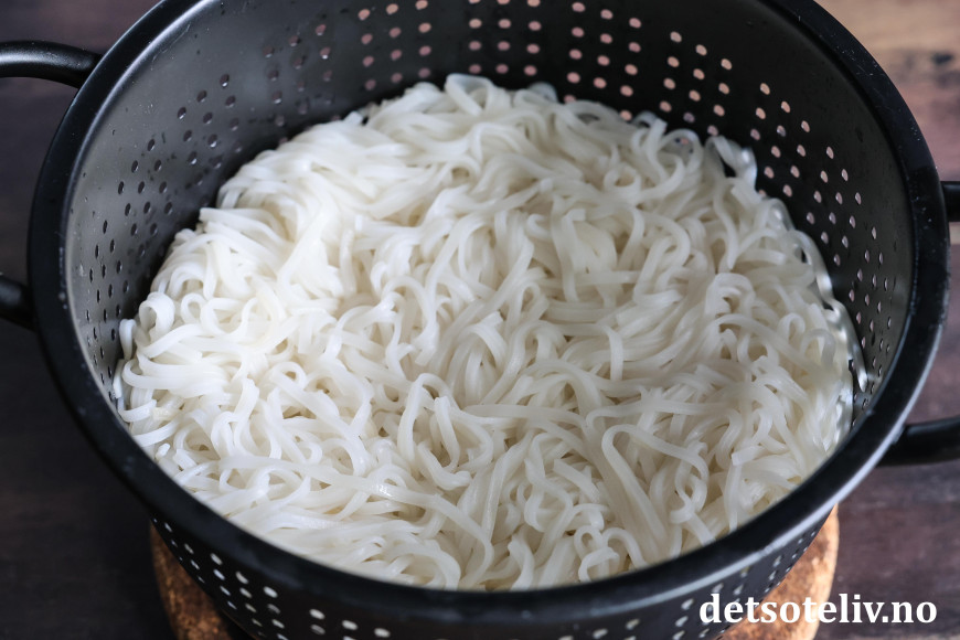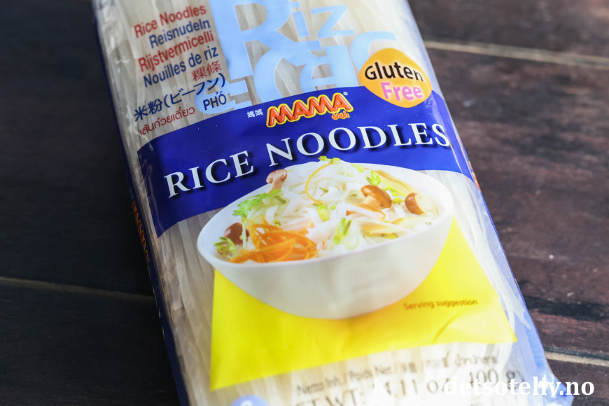 ♥ Risnudler fås kjøpt i de fleste, norske matbutikkene (de på bildet er kjøpt i asiatisk matbutikk). Nudlene er stive i pakningen, men blir raskt myke når de legges i varmt vann. Risnudler blir mest "sticky", men du kan alternativt bruke asiatiske eggnudler (kok som anvist på pakningen).