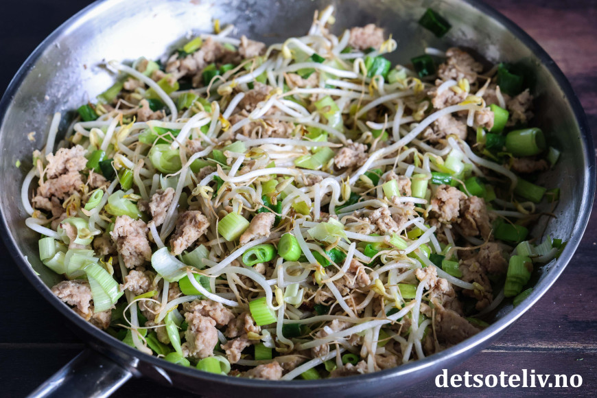 Ha kyllingkjøttdeig og fint snittet purreløk i en stor stekepanne sammen med olje. Stek i et par minutter til kyllingkjøttdeigen begynner å bli gjennomstekt og purreløken er gyllen. Tilsett kuttet vårløk og bønnespirer. Bland godt og stek i et par minutter til.