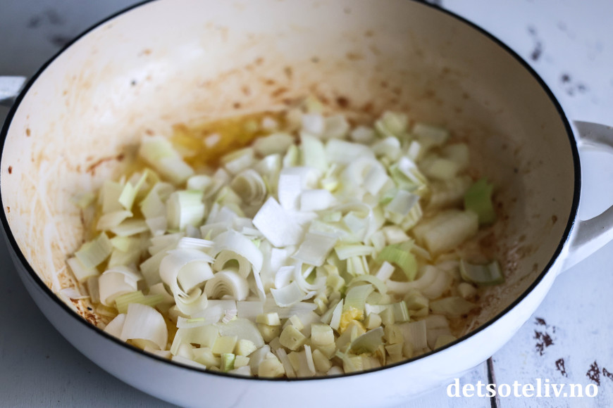 Smelt smøret i pannen. Tilsett hakket løk, hvitløk og purreløk.