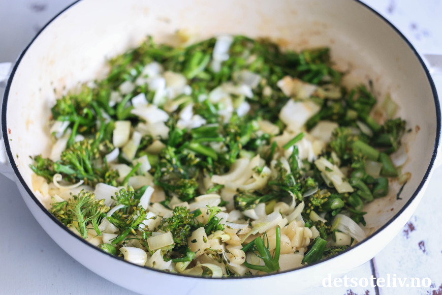 Smelt smøret i pannen. Tilsett hakket løk, hvitløk og purreløk. La dette surre på middels varme i noen minutter til løken begynner å mykne. Tilsett brokkoli som er kuttet i små biter og la dette steke videre på middels varme i et par minutter til.