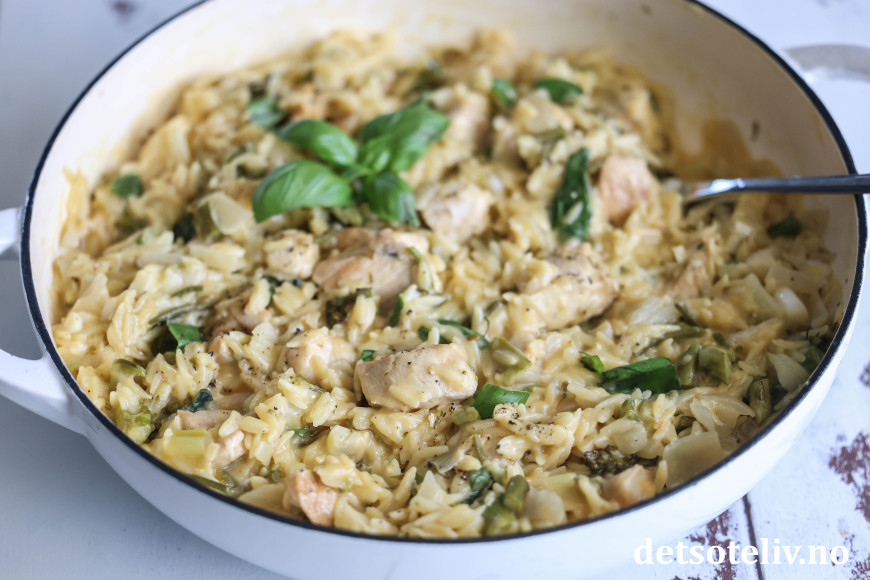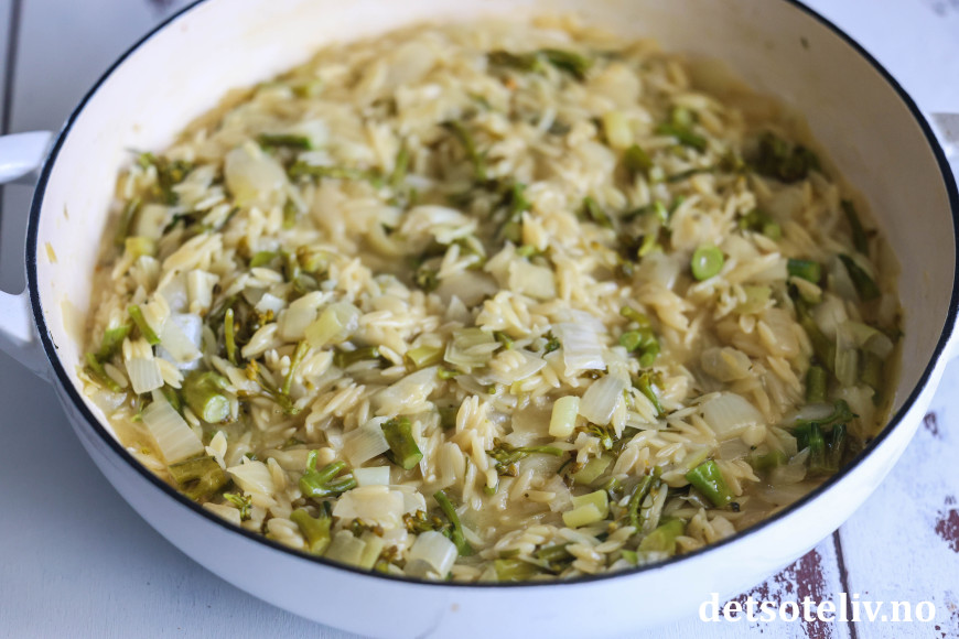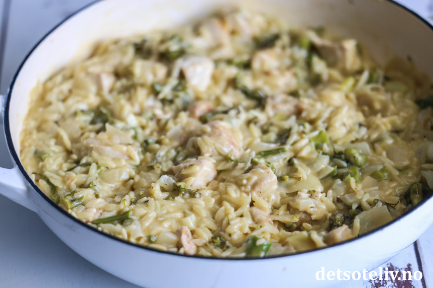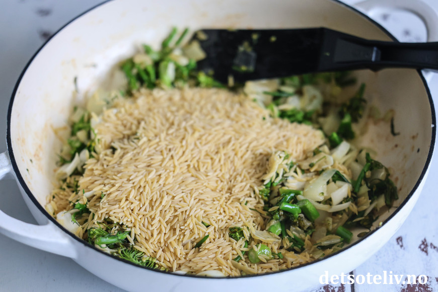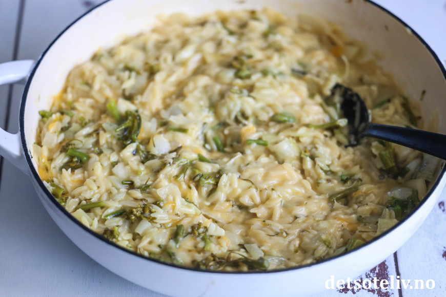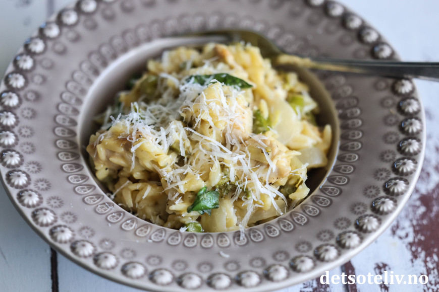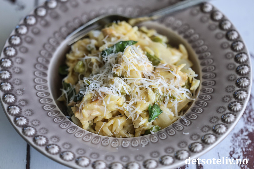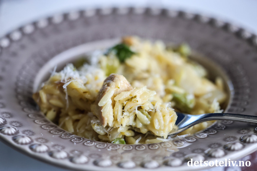 Risoni tilberedt på denne måten blir litt lignende risotto, men likevel annerledes. Supergodt blir det i hvert fall! 😋