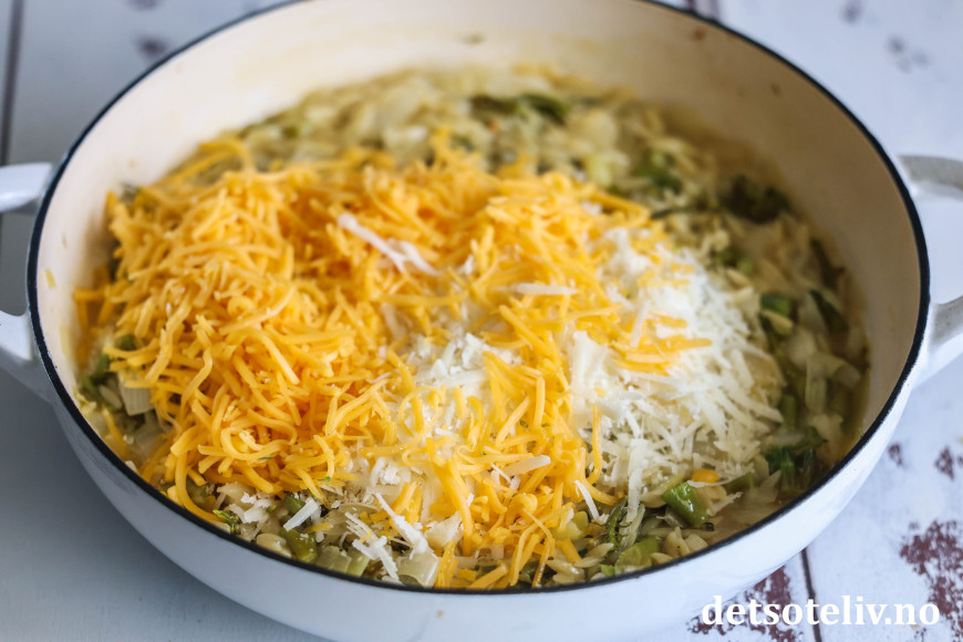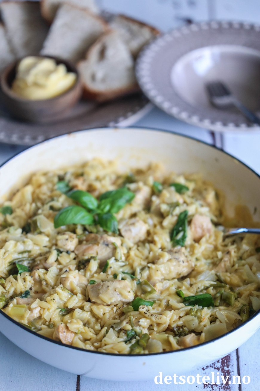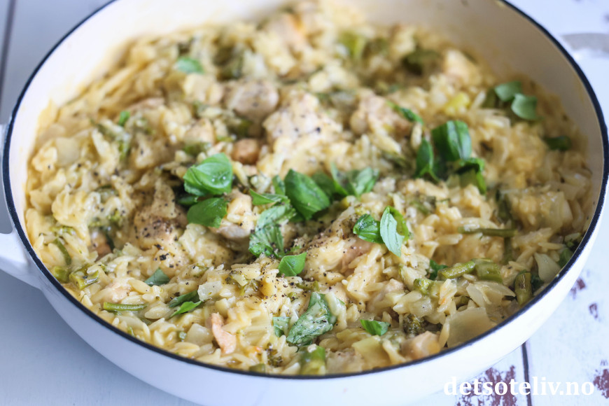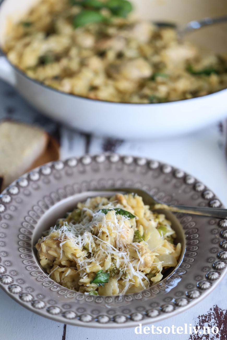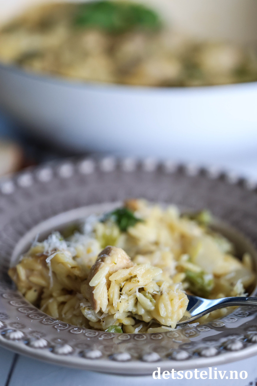 Her kommer en kjempegod og enkel "one pot-rett" med risoni, kylling, løk, hvitløk, brokkoli - og masse revet parmesan og cheddar!