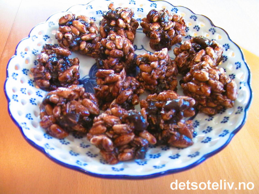 Smelt smøret i en kjele. Rør inn sukker, sirup og kakao til alt er godt blandet. Tilsett kokos, rosiner og puffet ris. Bland godt.