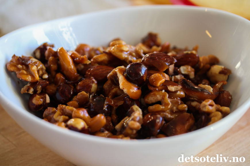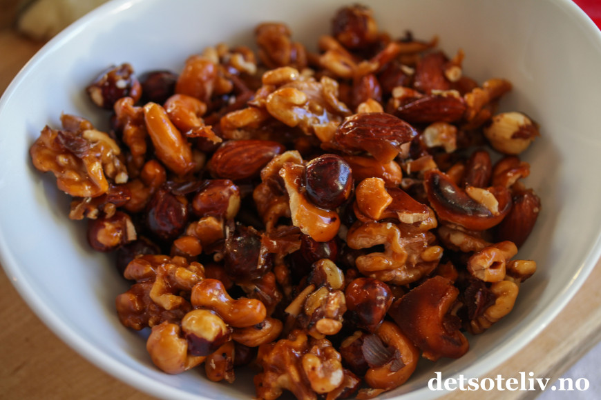 Du kan varierer hvilke typer nøtter du bruker. Oppskriften er beregnet til ca. 8 dl nøtter, men du kan jo såklart skalere den opp eller ned.