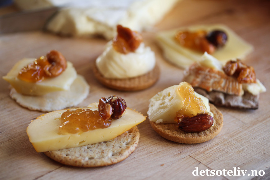Og server ostene sammen med noen forskjellige kjeks, og gjerne noen søte marmelader eller geléer - hjemmelagde (se mange forskjellige oppskrifter i ostekategorien her på Det søte liv) eller kjøpte varianter.