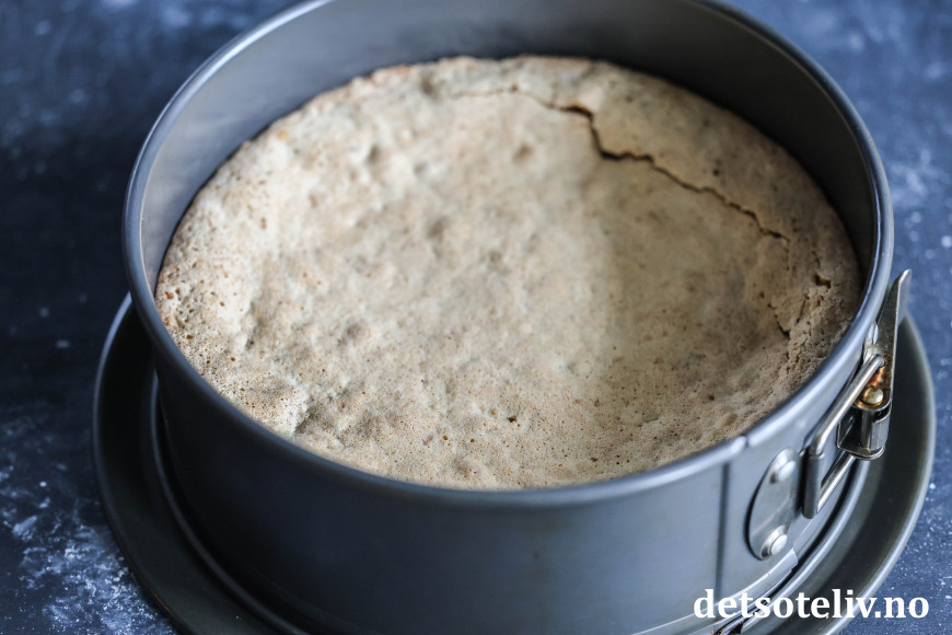 Ha deigen i en rund form (24 cm i diameter) med bakepapir i bunnen. Stek kaken midt i ovnen ved 180°C i 20 minutter. Avkjøl kaken helt i formen.