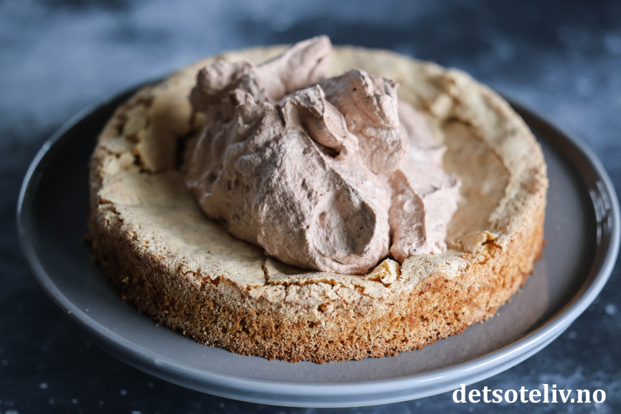 Ha deigen i en rund form (24 cm i diameter) med bakepapir i bunnen. Stek kaken midt i ovnen ved 180°C i 20 minutter. Avkjøl kaken helt i formen. Ta den ut av formen og fjern bakepapiret. Sett kaken på et passende fat.
