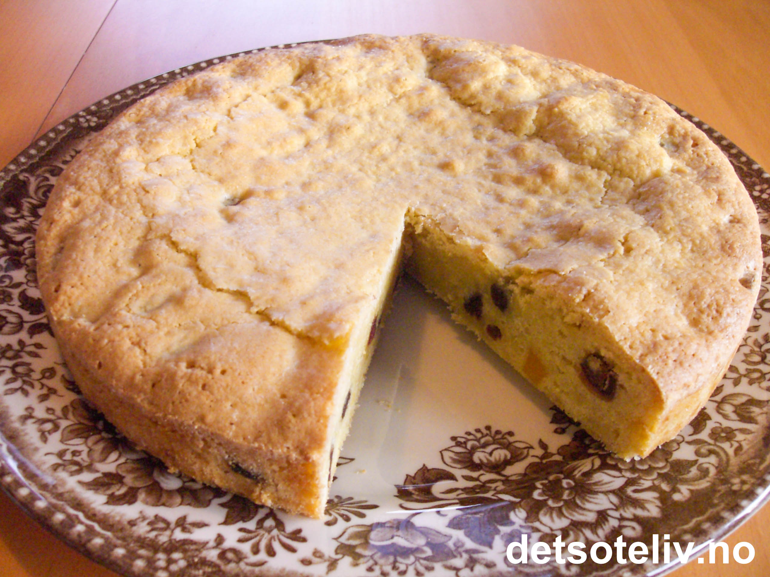 Hell deigen i en liten rund form (20 cm i diameter) med bakepapir i bunnen. Stek kaken på rist midt i ovnen ved 160°C i 40 min.