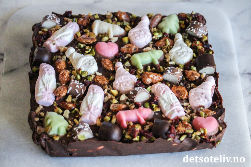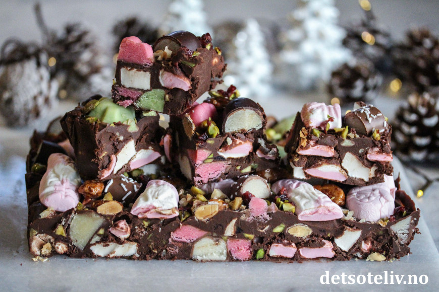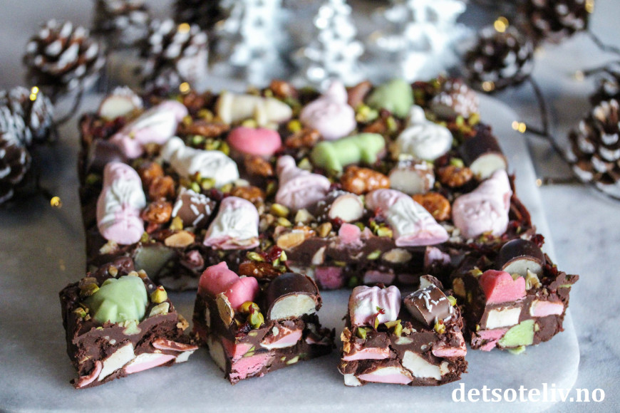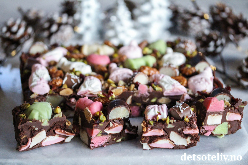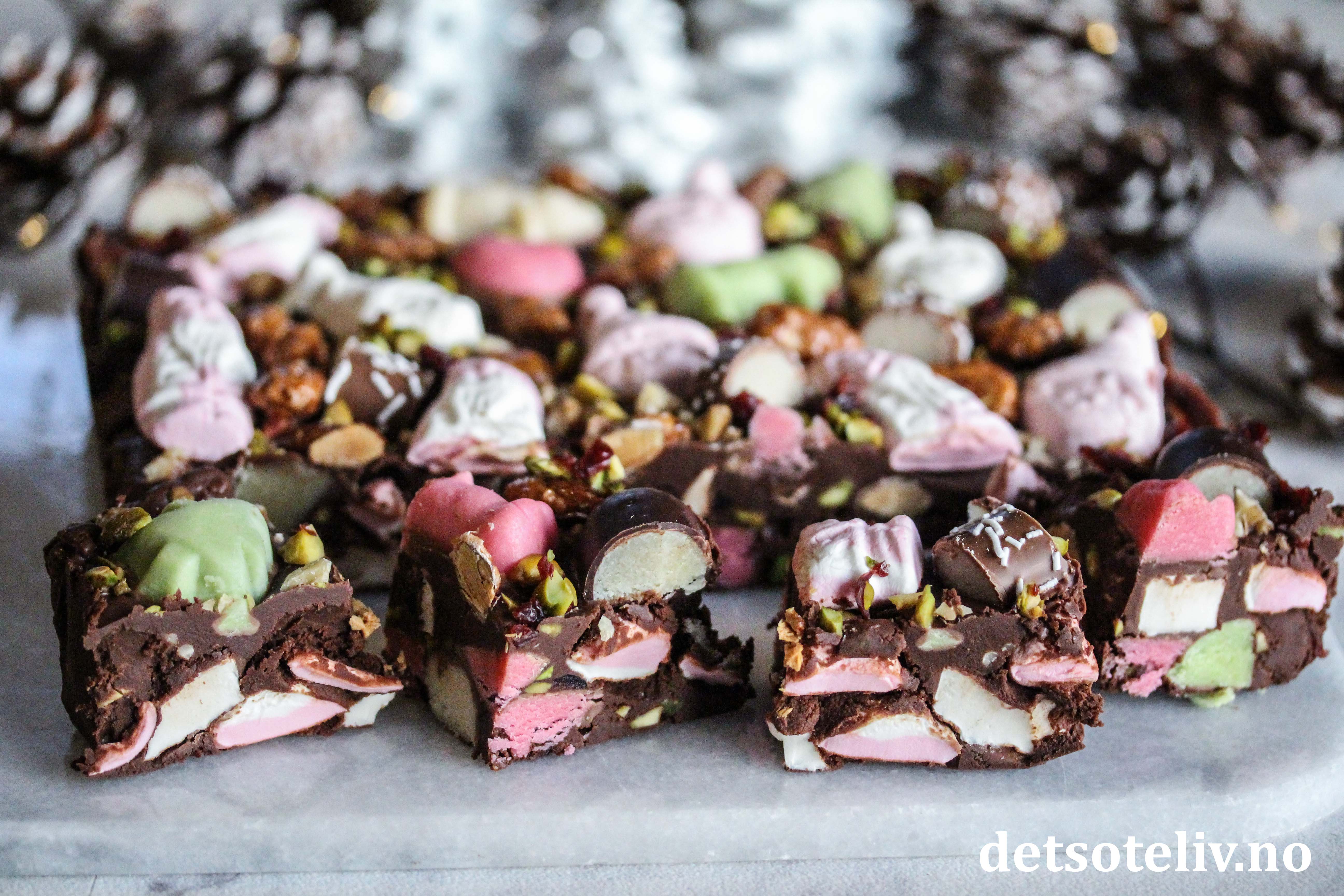 Rocky Road er en superpopulær, amerikansk konfekt som består av søt sjokolade som blandes med det du måtte like av kjeks, sjokolader, nøtter, marshmallows osv.