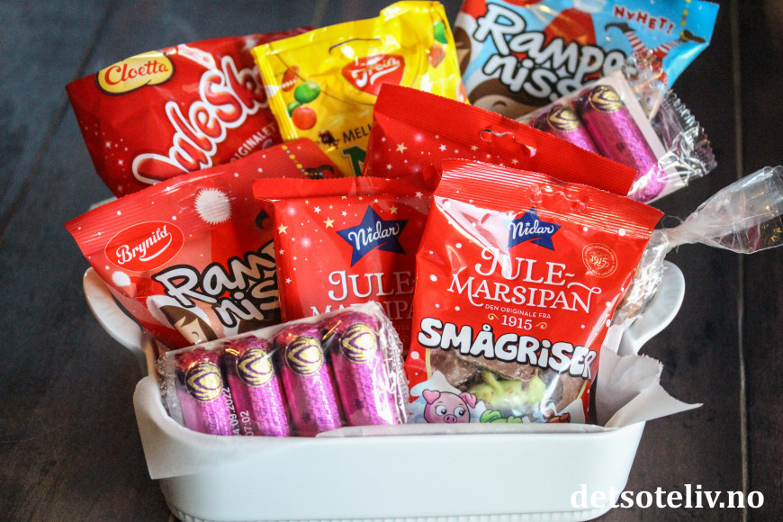 ♥ Jeg har her brukt diverse julegodteri, men du står fritt til å bruke andre varianter. Bare pass på at totalvekt blir noenlunde det samme.