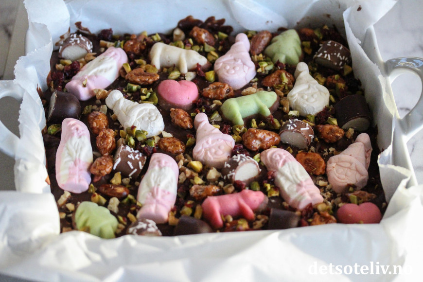Lagde denne her med delte pistasjnøtter, hassel, puffet ris, marshmallows, tranebær, kakestrø. Men..jeg dobla oppskrifta. Synes likevel det ble for lite sjokoladefyll, hvis du kan kalle det det. Synes ikke det dekka nok, så måtte ha på mer over etterpå.