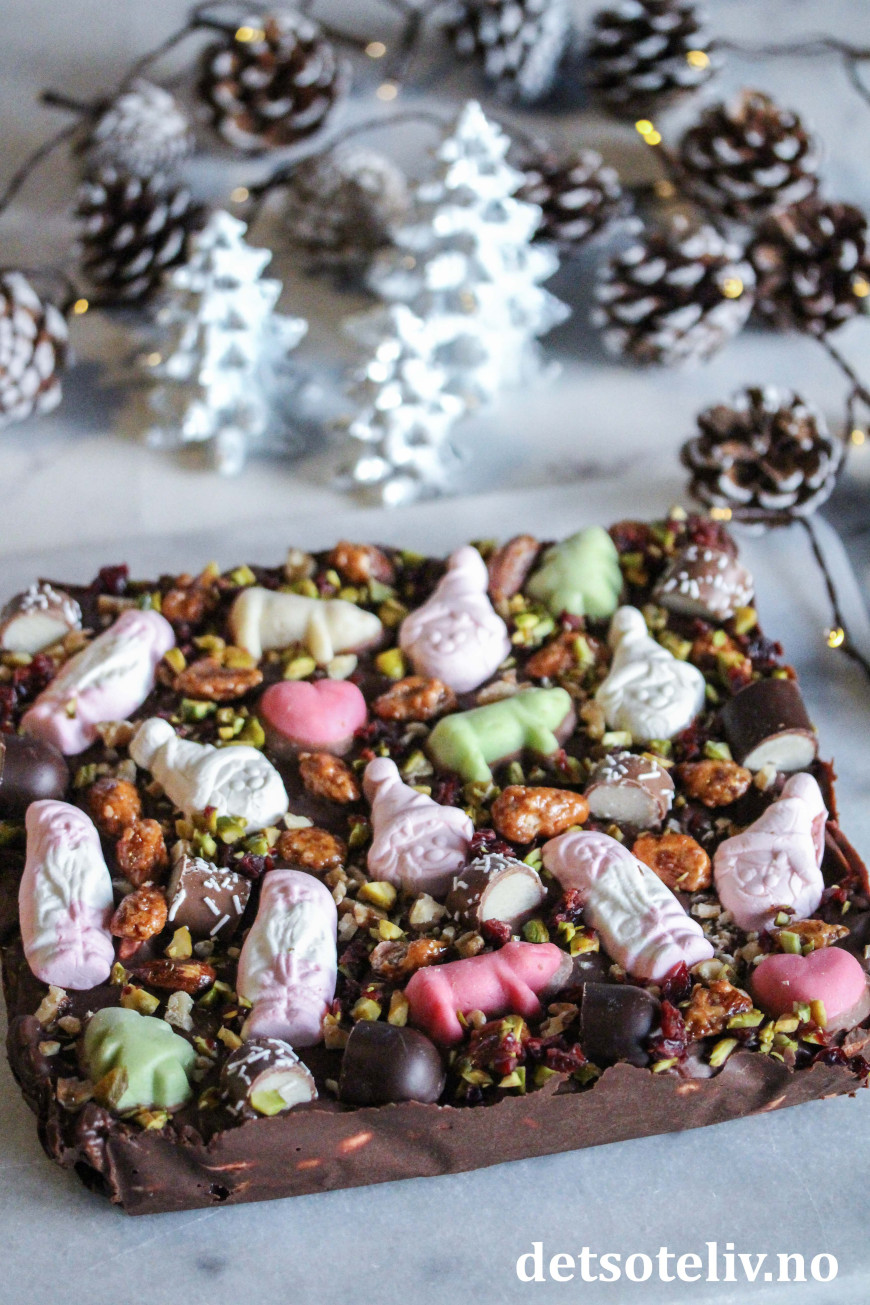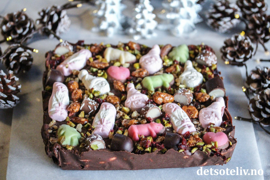 Smør resten av den smeltede sjokoladeblandingen på toppen og pynt med resten av julegodteriet. Dryss over fint hakkede pistasjnøtter og tranebær til slutt.