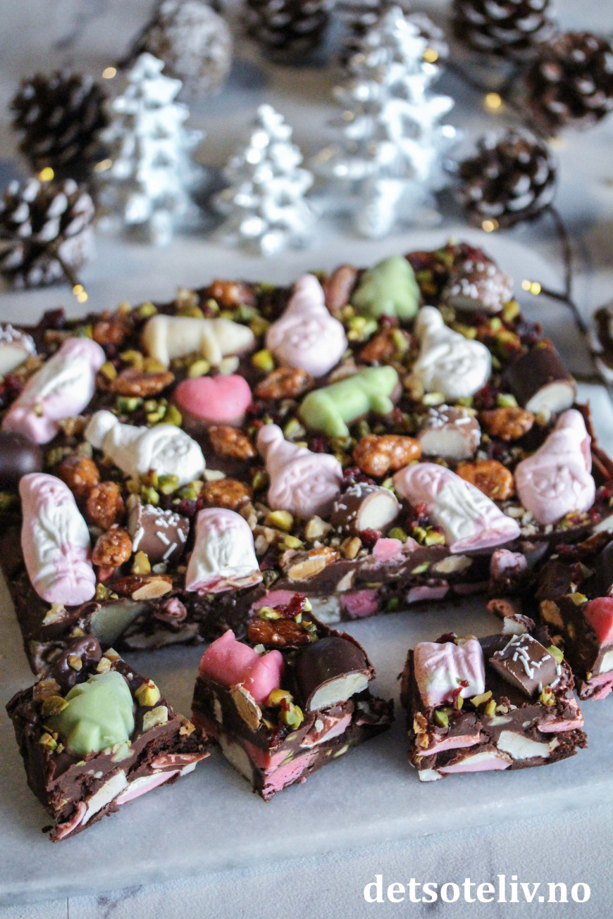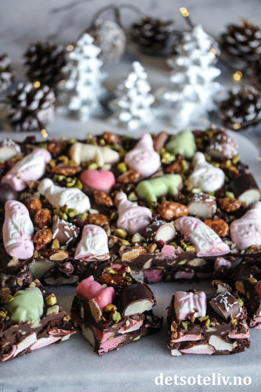 Alle varianter av Rocky Road egner seg som julekonfekt. Her har jeg imidlertid laget en ekstra julete variant av Rocky Road der jeg har brukt samme sjokoladebase som tidligere, og så tilsatt diverse julegodteri slik som sjokoladefigurer, julemarsipan, skumnisser, rampenisser, brente mandler, pistasjnøtter, tørkede tranebær mv.