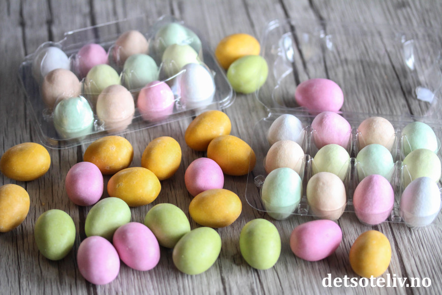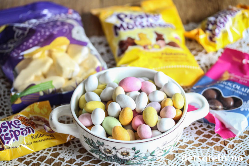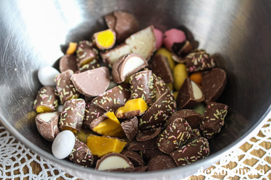 ♥ Jeg har her brukt diverse påskegodteri, men du står fritt til å bruke andre varianter. Bare pass på at totalvekt blir noenlunde det samme.