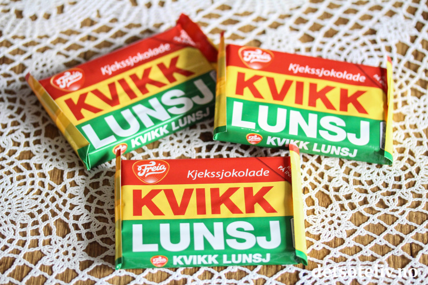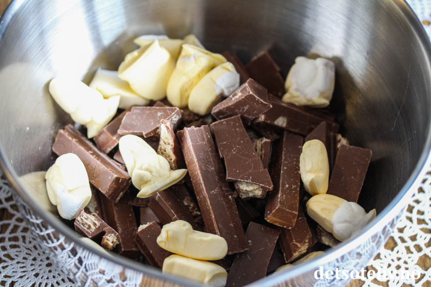 Klipp påskeskum på midten og knekk opp Kvikk Lunsj i biter (spar noe til pynt som gjerne kan beholdes hele).