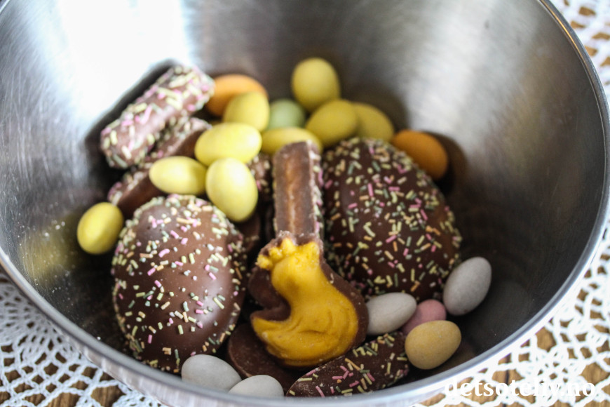 Skjær store påskeegg og -sjokolader i mindre biter.