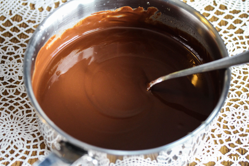 Smelt smør og sirup. Ta kjelen av platen. Tilsett oppdelt kokesjokolade og la sjokoladen smelte. Rør blandingen jevn.