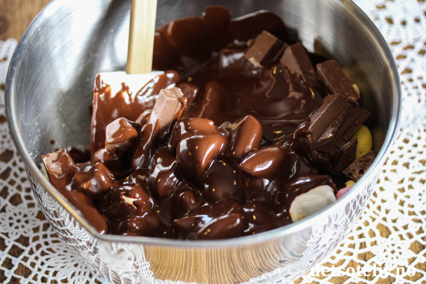 Smør resten av den smeltede sjokoladeblandingen på toppen og pynt med resten av påskesnopet. Noen påskeegg kan gjerne knuses og drysses over toppen.