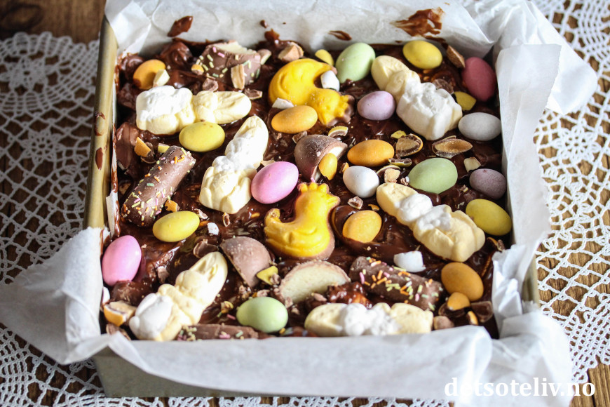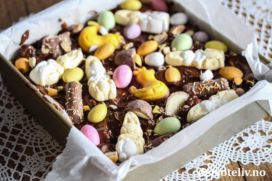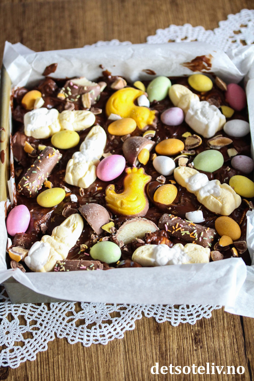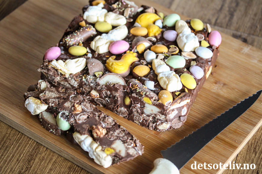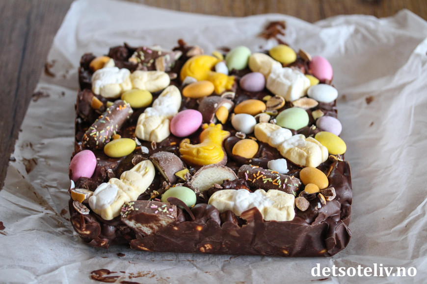 Med denne oppskriften på Rocky Road kan du lage sjokoladegodteri med påskesnop! 😃