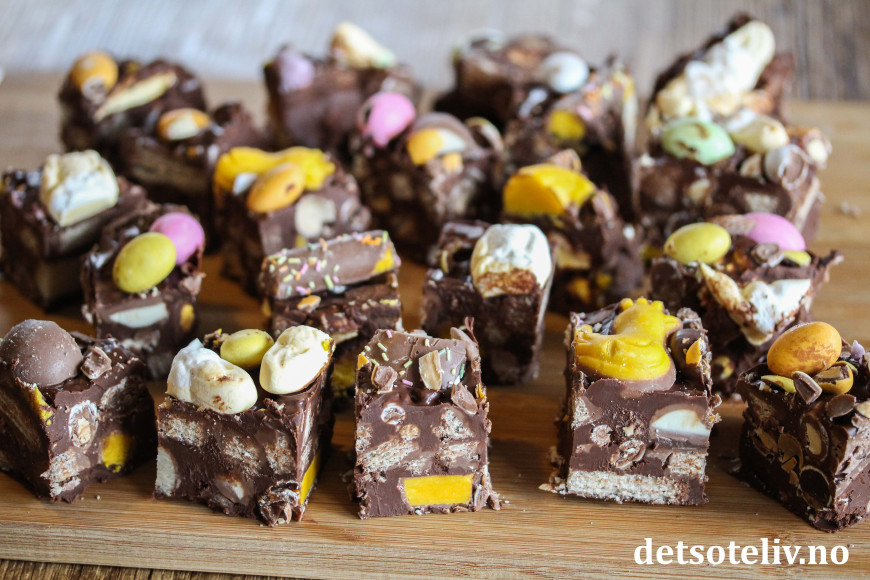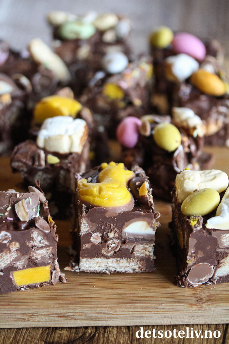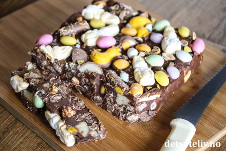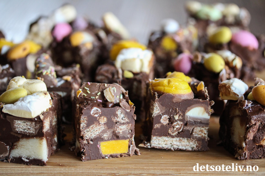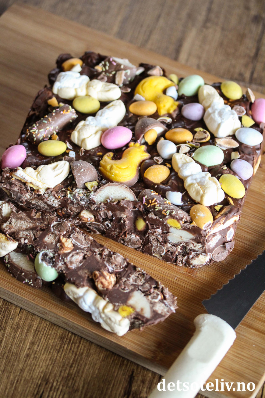 Med denne oppskriften på Rocky Road kan du lage sjokoladegodteri med påskesnop! 😃