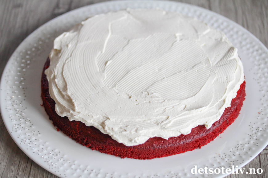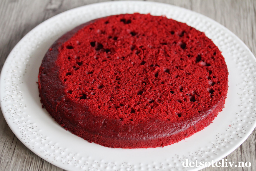 ♥ For å få skikkelig kraftig rødfarge på kakebunnene, har jeg brukt en hel boks konsentrert rød konditorfarge (såkalt pastafarge) i kakebunnen. Dette tilsvarer ca. 2 spiseskjeer.