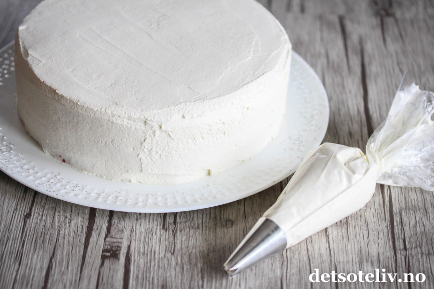 Dekk hele kaken med mascarponekrem, men hold av noe til pynt.
