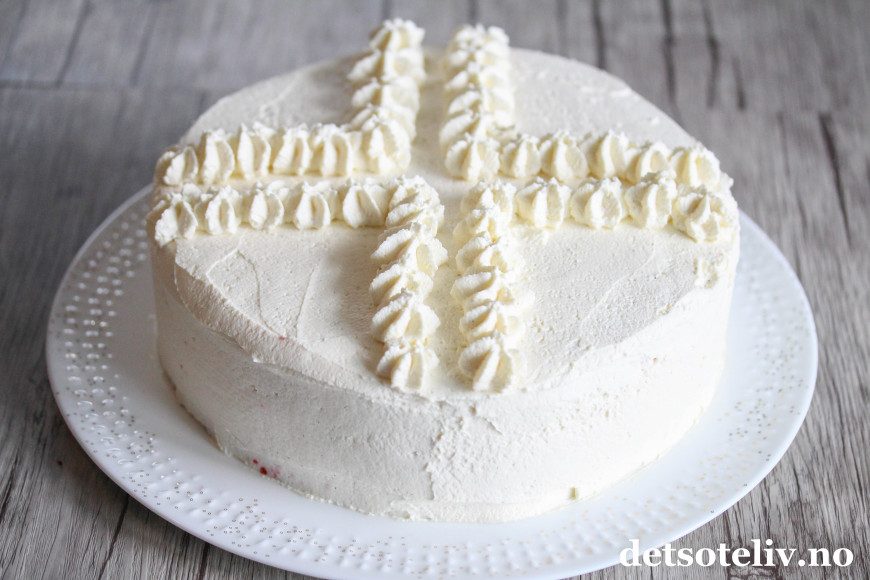 Sprøyt de hvite rutene i det norske flagget på toppen av kaken.
