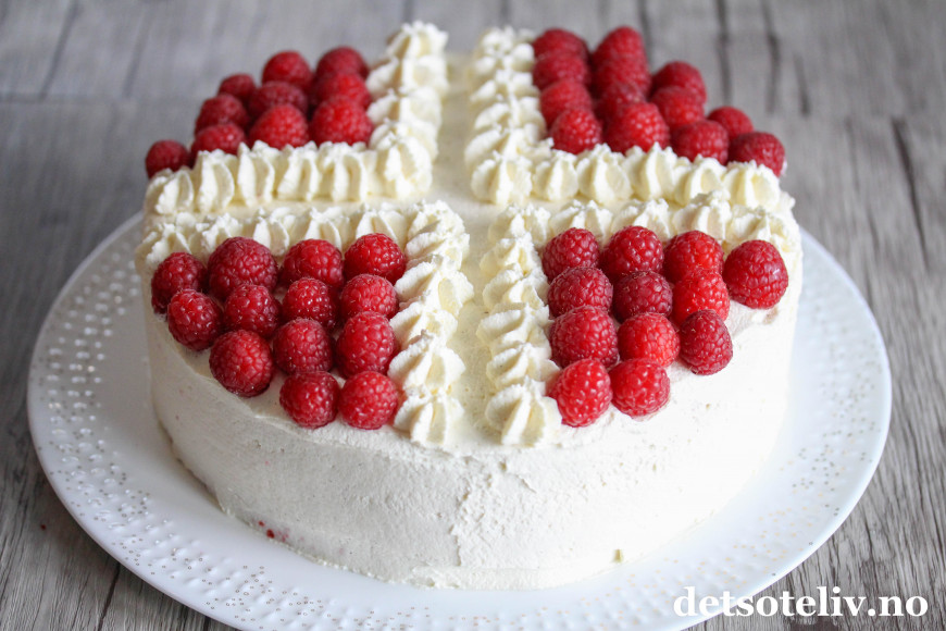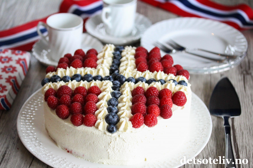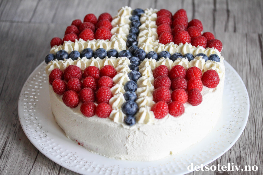 Ha resten av mascarponekremen i en sprøytepose. Sprøyt de hvite rutene i det norske flagget på toppen av kaken. Fyll opp med bringebær og blåbær så du får det norske flagget.