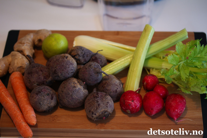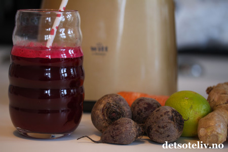 Jeg blander i tillegg selleri, gulrot, et par reddiker og en skvett lime og ingefær i drikken min, som bare gjør rødbetjuicen enda bedre og sunnere. Her kan du variere med det du har for hånden og smake deg frem til det du liker best.