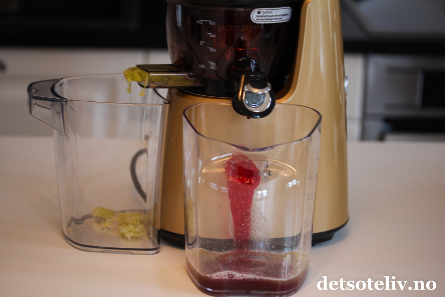 Den pressede juicen renner ned i den ene beholderen, mens avfallet havner i den andre.