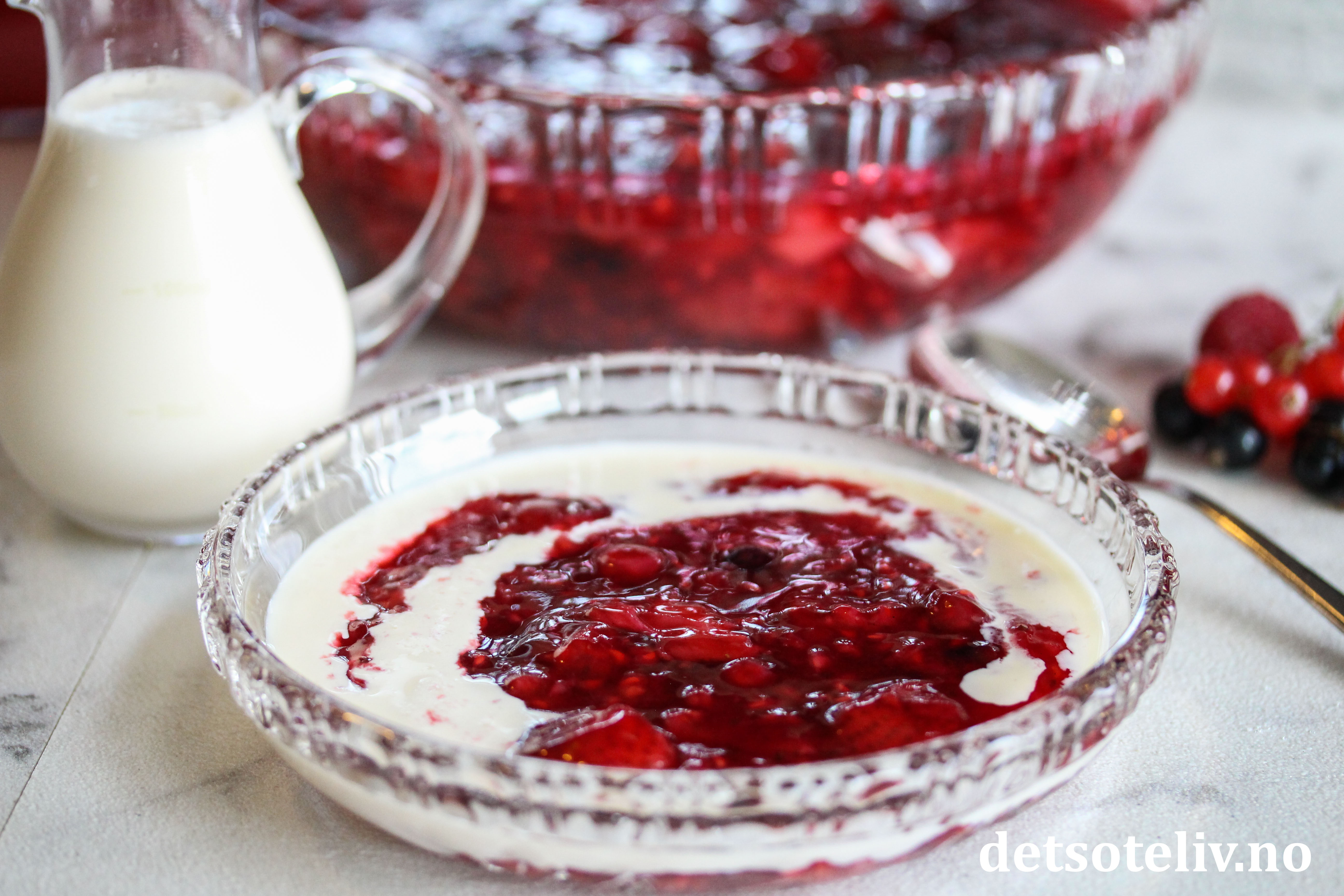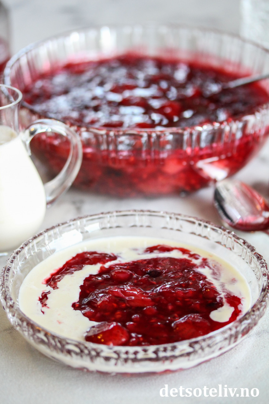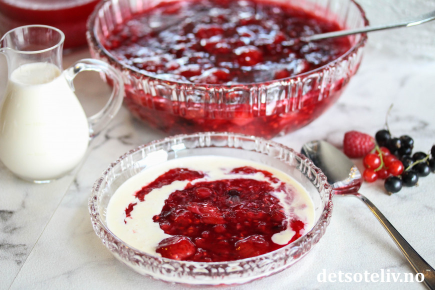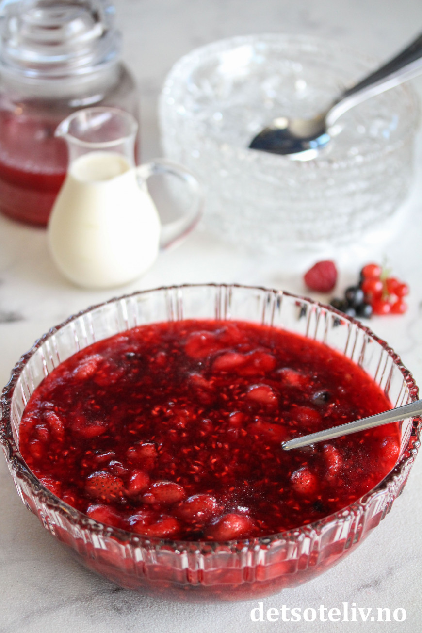 "Rødgrød med fløde" er en dansk sommerklassiker, som lages med et utvalg av sommerbær. Jeg har brukt den mest klassiske kombinasjonen, som er jordbær, bringebær, rips og solbær. Det går også fint å tilsette bjørnebær, blåbær, stikkelsbær og rabarbra. Dette er med andre ord en utmerket måte å bruke opp rester av bær du måtte ha liggende.