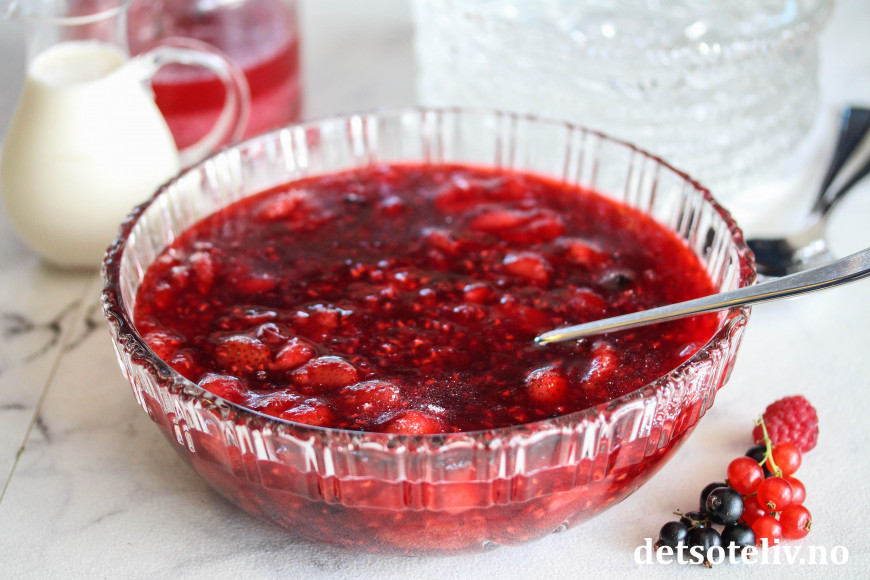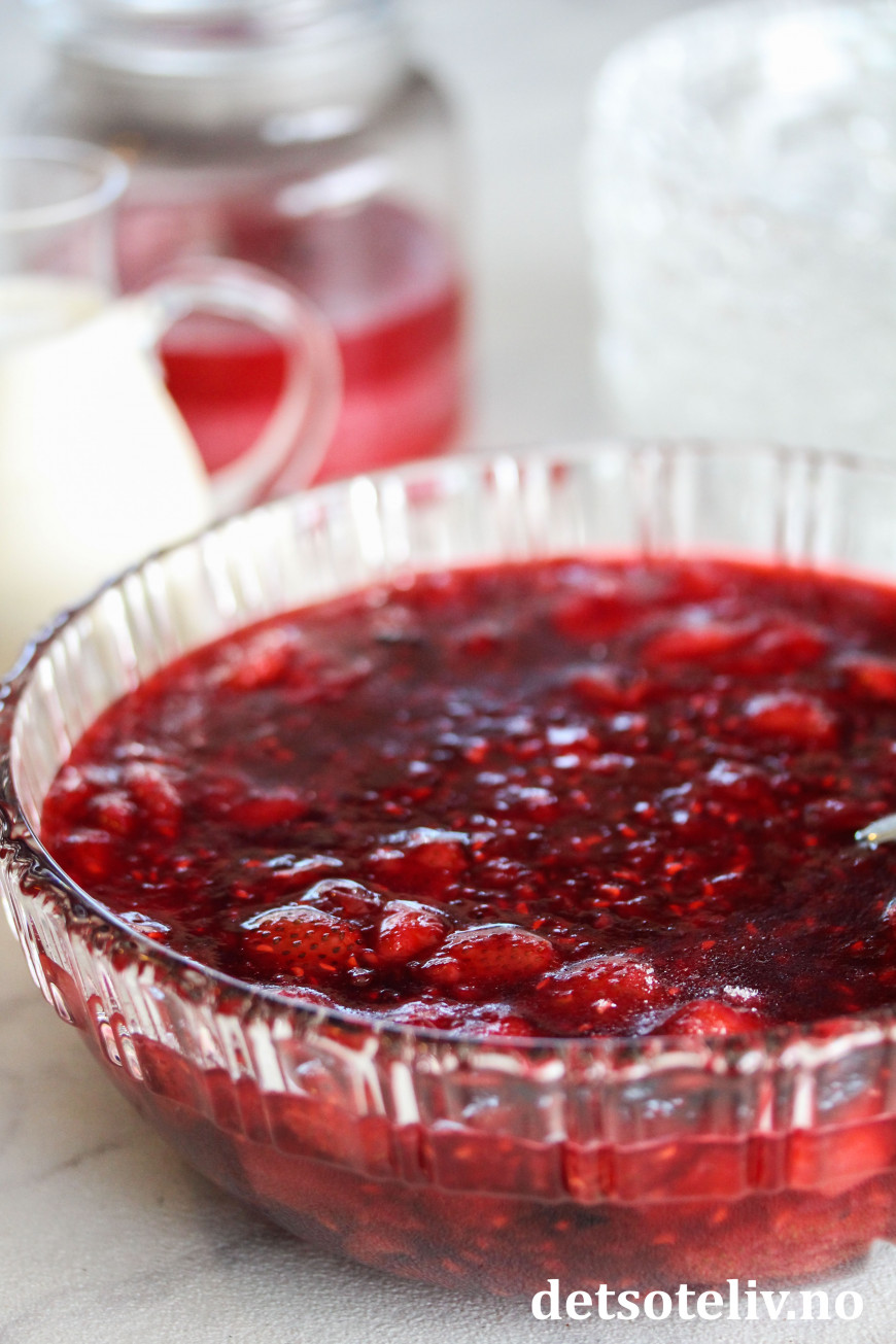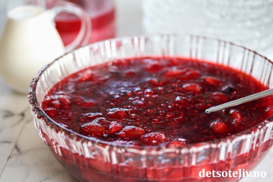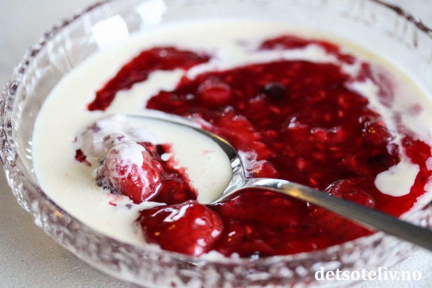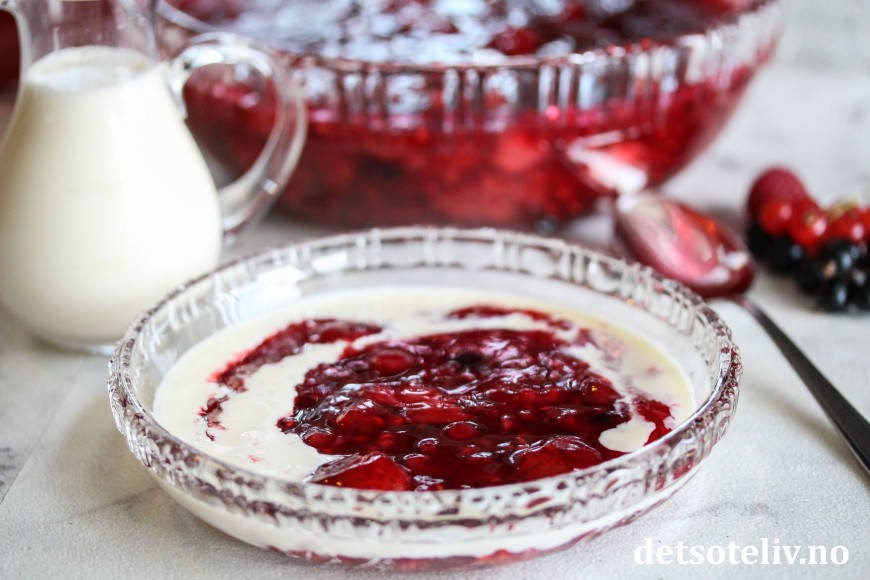 "Rødgrød med fløde" er en dansk sommerklassiker, som lages med et utvalg av sommerbær. Jeg har brukt den mest klassiske kombinasjonen, som er jordbær, bringebær, rips og solbær. Det går også fint å tilsette bjørnebær, blåbær, stikkelsbær og rabarbra. Dette er med andre ord en utmerket måte å bruke opp rester av bær du måtte ha liggende.