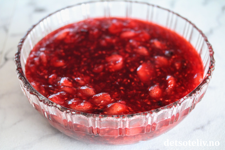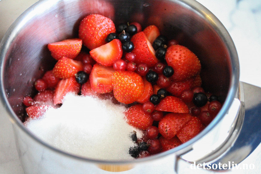La blandingen gjerne stå i romtemperatur i 30-45 minutter, slik at bærene begynner å avgi saft.