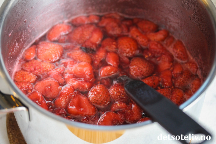 Rens bærene og ha dem i en middels stor kjele sammen med vann, sukker og vanilje.