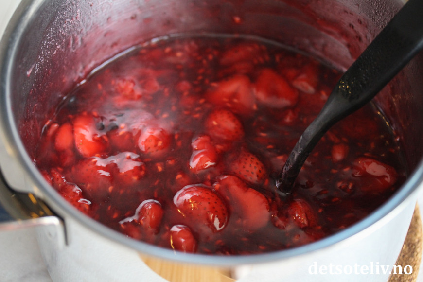 Varm opp på middels varme og la bærene småkoke i noen minutter, til du ser at bærene begynner å gå i oppløsning. Ta kjelen av platen.