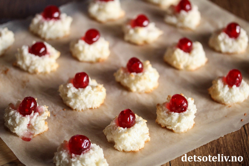 Disse søte småkakene er lekre å servere både på sommerstid og til jul. Rødmende kokosmakroner blir deilige, myke og seige og ser veldig dekorative ut på kakebordet!