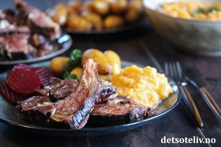 ♥ Jeg gjorde det ikke denne gangen, men ferdigdampet pinnekjøtt kan gjerne grilles kort i stekeovnen. Legg det i så fall på en rist og ha en stekeplate under (ellers drypper fettet ned i ovnen). Stek pinnekjøttet midt i ovnen ved 240°C i 5 - 10 minutter (følg nøye med så pinnekjøttet ikke blir tørt).