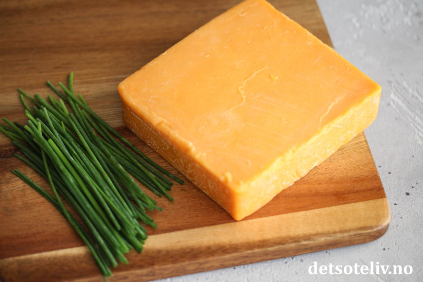 Ha rømmen i en bolle og tilsett gressløk og cheddar.