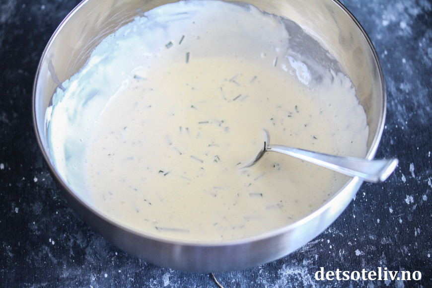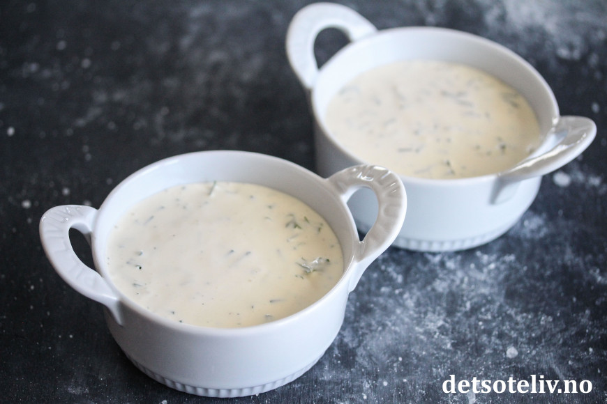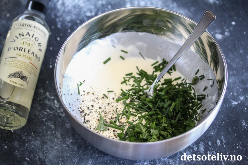 Bland sammen rømme, majones, eddik og urter. Spe med kefir til passe tykk konsistens.